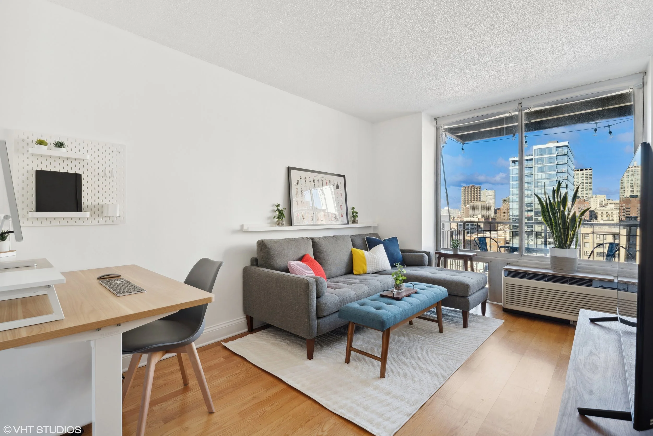 Walking toward the living space, you will be greeted with breathtaking, uninterrupted views of the city’s north side. The room is illuminated by floor-to-ceiling windows that lead to a private outdoor area. Spend your evenings relaxing on the balcony (complete with new floorboards!) – to the east, you can catch a glimpse of the lake, or to the west, take in a bird’s eye view of Wrigley Field. The convertible-style bedroom shares the same stunning view while also providing privacy from the living area. A spacious full-size bathroom rounds out the unit, with plenty of storage and closet space available. There’s also an option to add in-unit laundry. Lastly, this home comes with a storage locker for added convenience.