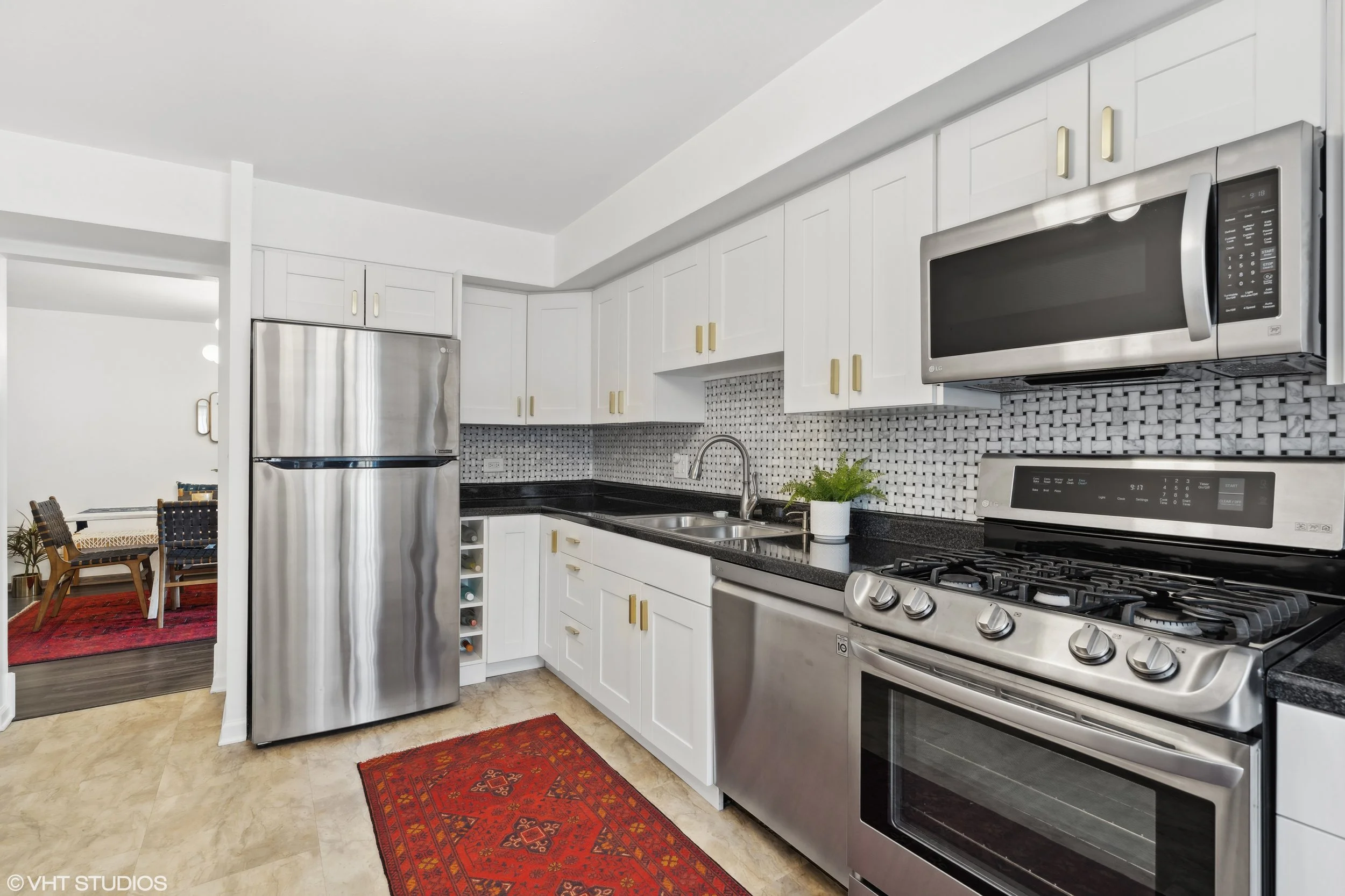 Upon entering this home, you will immediately take note of the dining room — ample in square footage & ideal for a 6-8 person table. Directly across is the kitchen, which boasts on-trend white cabinets with gold pulls, a black & white tile backsplash, durable countertops, & stainless steel appliances. Natural light pours into the kitchen through the window, making this room a delightful spot for cooking & casual dining.