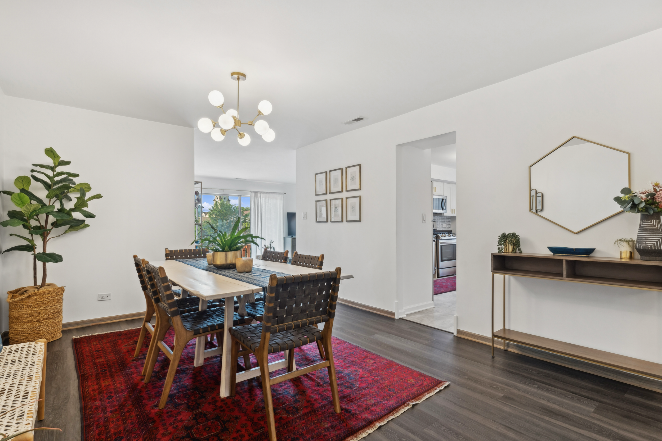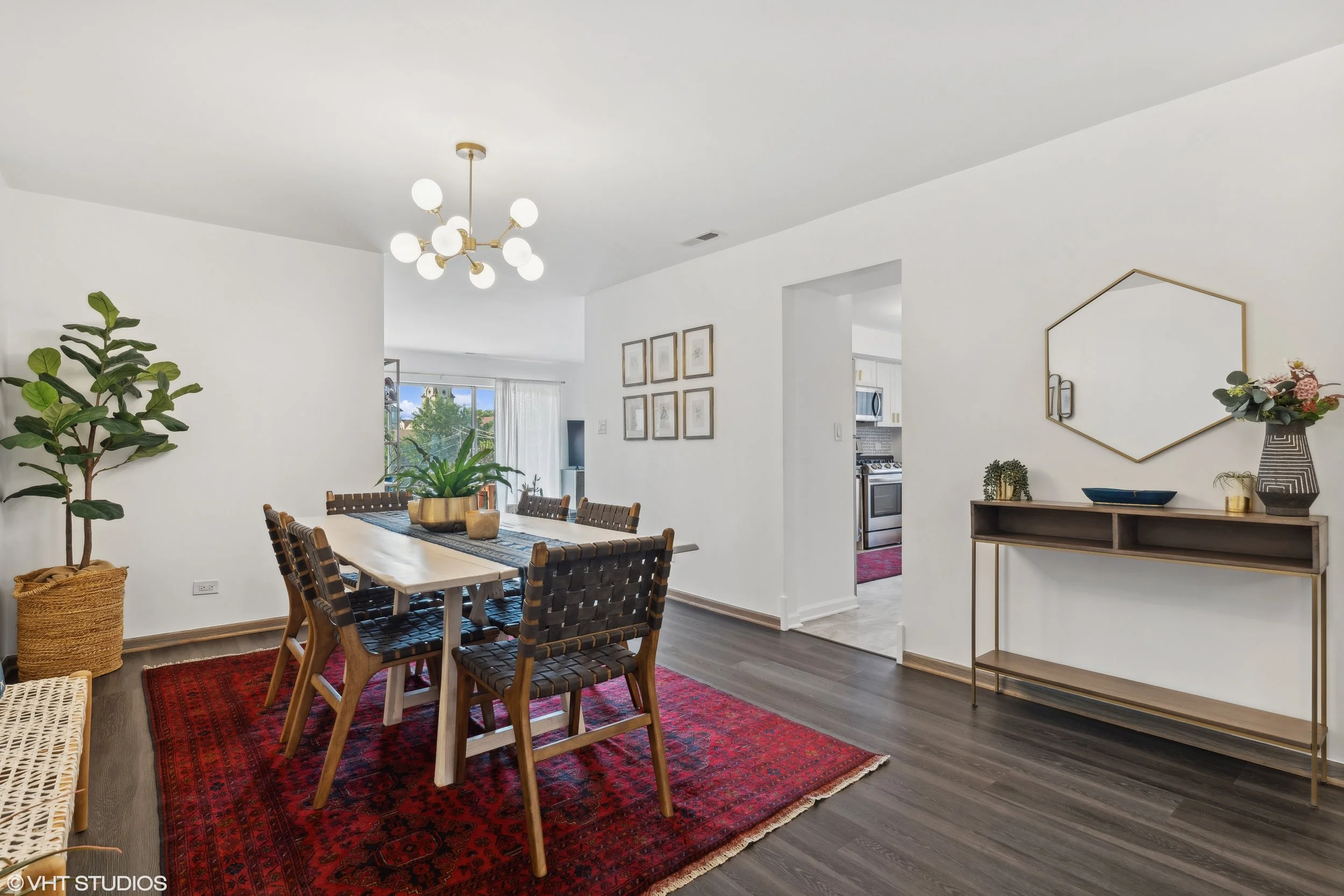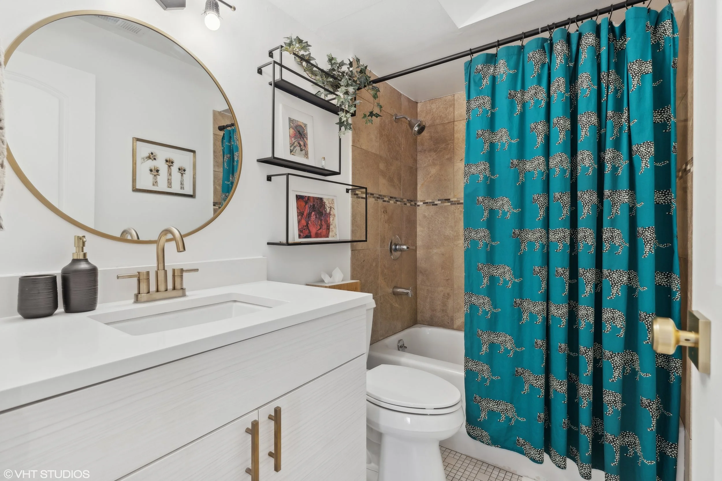 The unique light fixtures completely elevate the space! Throughout the home, you’ll find bold, gold lighting – we love it!