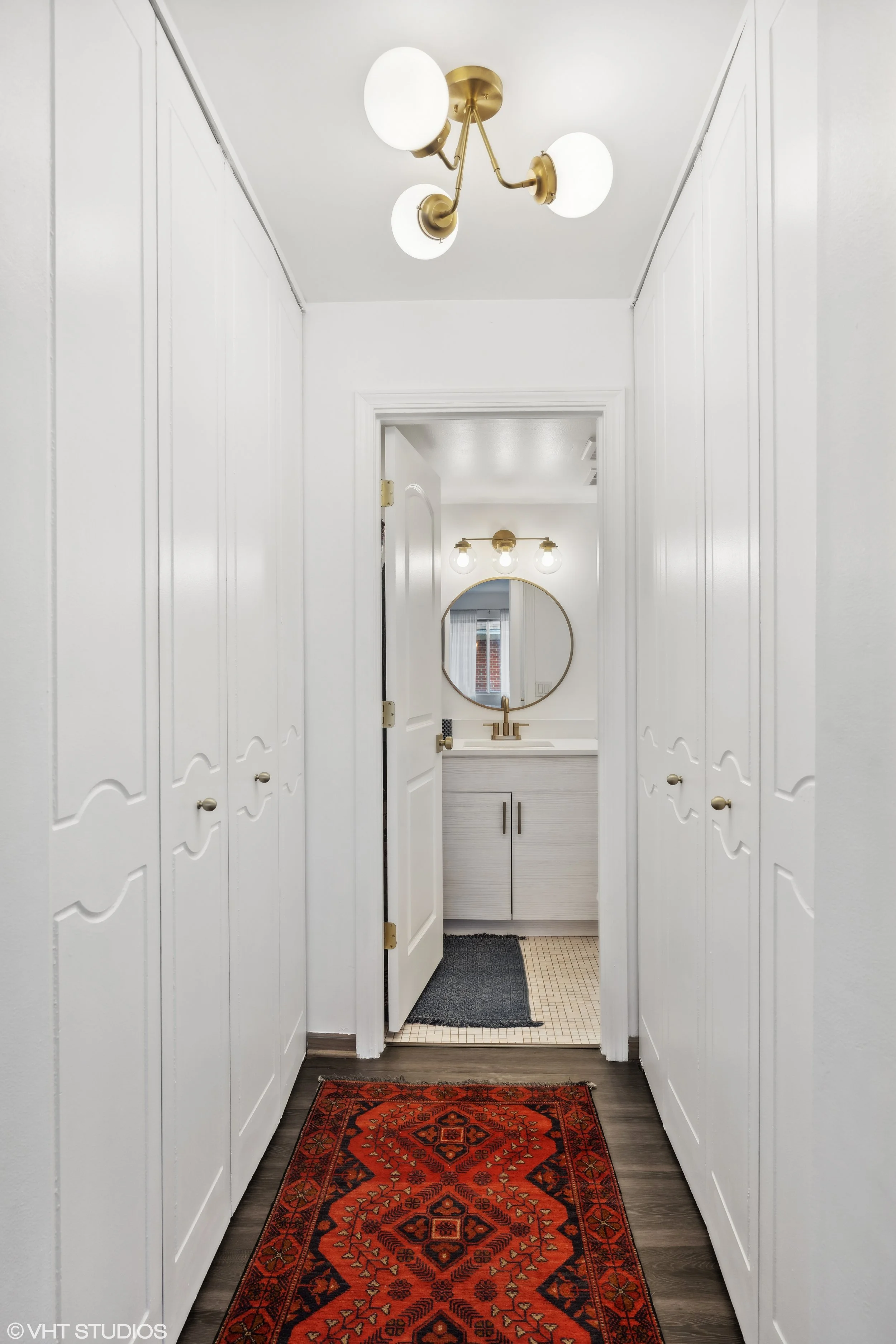 From there, explore the bedrooms. The primary is lovely & peaceful with light flowing in. Dual closets line the hallway leading to the en-suite primary bath. In the primary bath, enjoy an updated vanity, new lighting, & a convenient tub/shower combo. The second bedroom is a great size as well, & the second bath offers a similar style as the primary with an updated vanity/lighting & tub/shower combo.